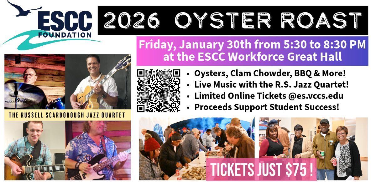 Now in its 7th year, the Eastern Shore Community College Foundation Oyster Roast returns on Friday, January 30, from 5:30–8:30 p.m. on the campus of Eastern Shore Community College. Proceeds support scholarships and student services that help local students enroll, complete their education, and gain job training.