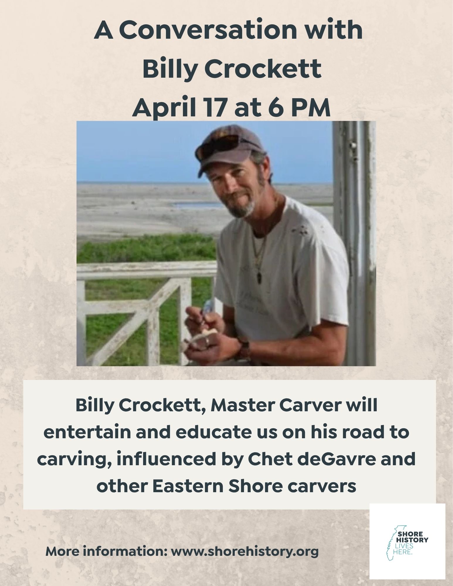 Billy Crockett, Master Carver, was tremendously influenced by legendary miniature carver Chet deGavre. Join us for an evening with Billy to hear of his journey to learn his craft from mentoring by Col. deGavre and through his love of wildlife on our Eastern Shore.