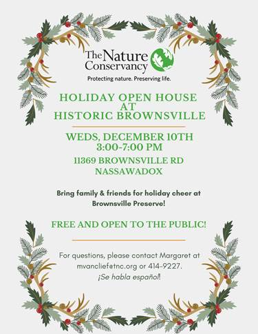 The Nature Conservancy invites one and all to our Holiday Open House at Brownsville Preserve in Nassawadox on Wednesday, December 10th from 3:00 to 7:00 pm. Visit with our staff and volunteers, tour the historic house, and enjoy holiday treats.